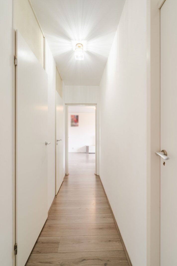 Je komt binnen via de gang. De lichte laminaat valt hierbij direct op en is voorzien door het hele appartement. Direct links heb je een slaapkamer. Volledig voorzien van strakke stucwerk. Dit geldt overigens voor de gehele woning.
